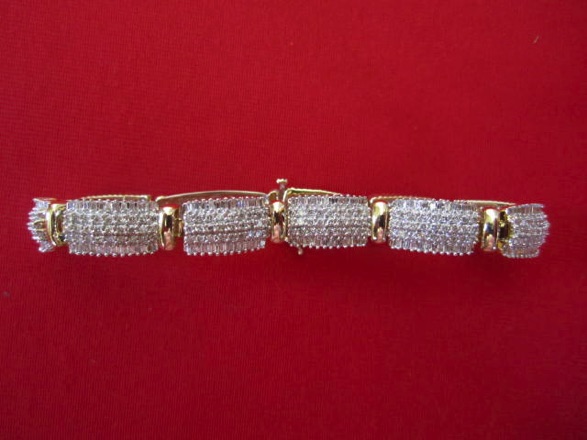 14K white and yellow bracelet gold with round brialliant and straight baguette cut diamonds totalling approximately 4.29 carats.