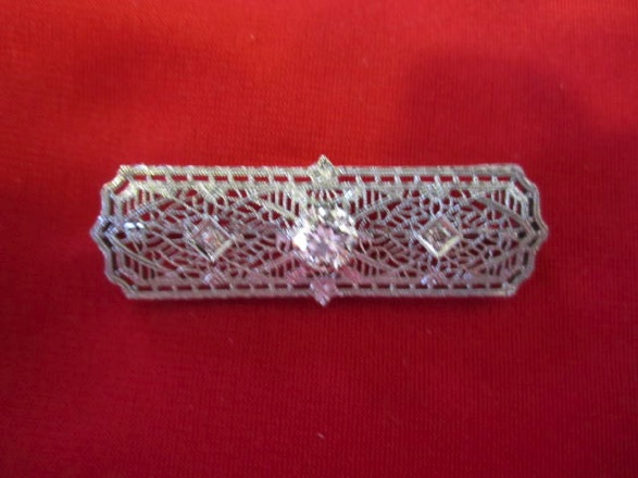 Platinum and 14K whtie gold filagres brooch with a center Old European cut diamond with an approximate weight of 1.03 carats, and 2 side round brialliant full cut diamonds totaling approximately 0.08 carats